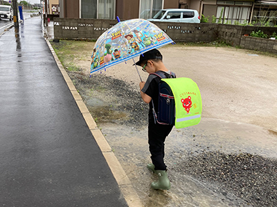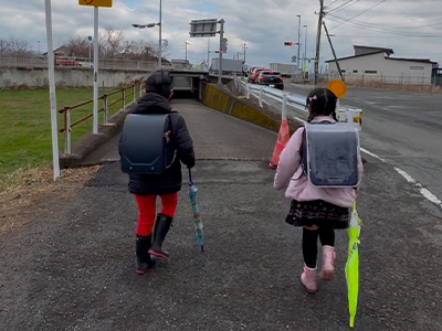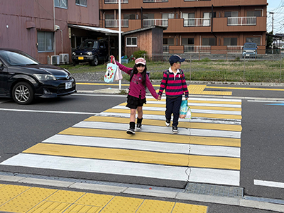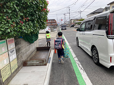 - ①子どもの目線から、車や自転車が見えにくい