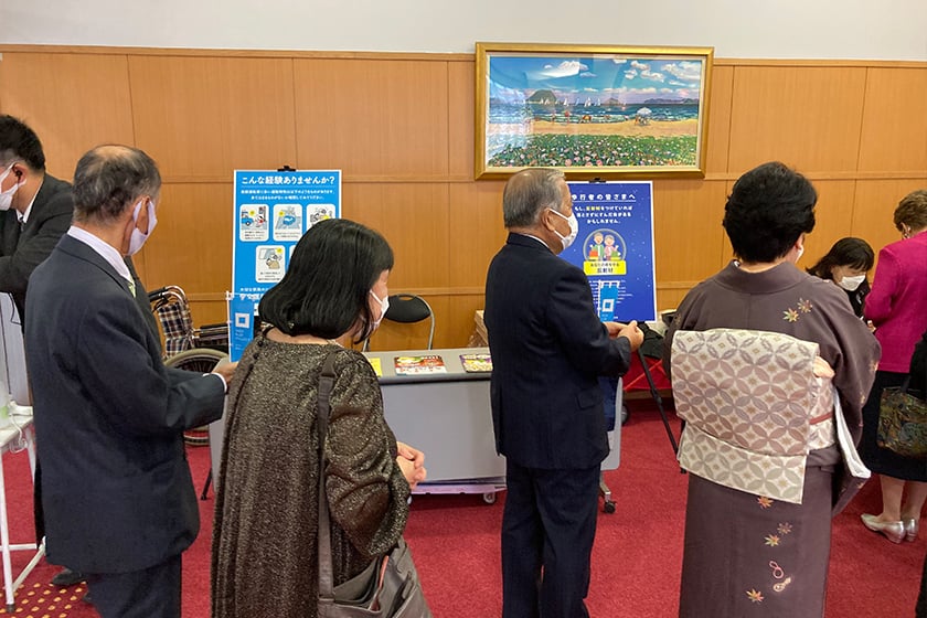 金婚さん表彰式において、反射材付きのエコバッグの配布とパネル展示を実施し、反射材着用の促進につなげました。